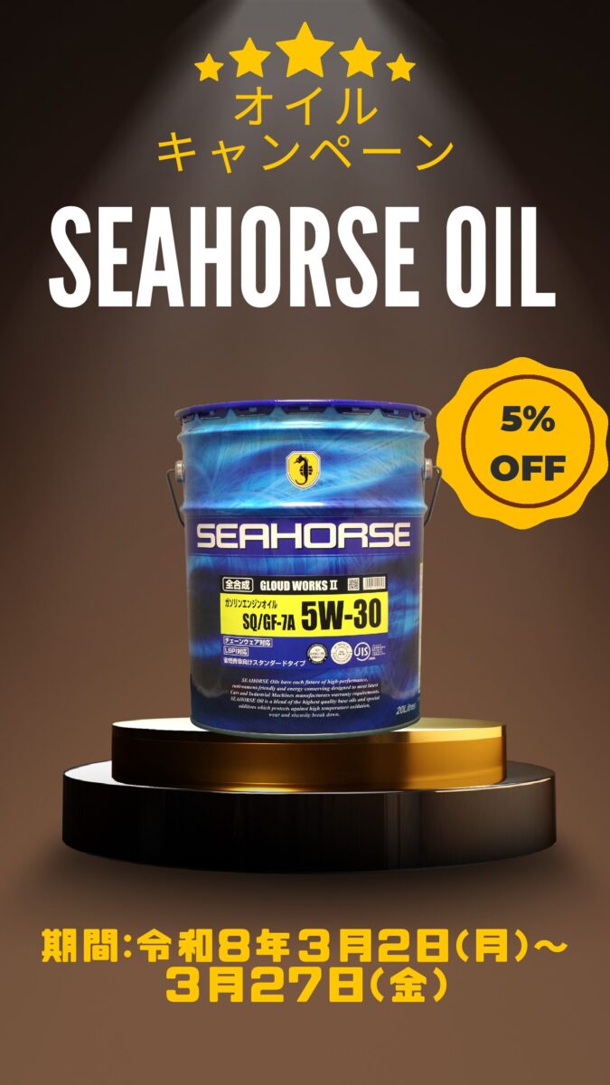 2026/03/02 おすすめ情報 おすすめ情報 SEAHORSE オイルキャンペーン 期 間:令和 8年 3 月 2 日 ( 月 ) ~ 3 月 27日 ( 金 )特典:表示価格から 5%OFF*価格表をご確認ください。 ( 価格表は値引き前) 価格表はこちら